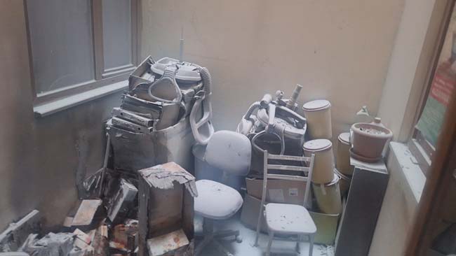 Özel koruma kıyafetli itfaiye ekipleri binaya girdikten sonra söz konusu yangını büyümeden söndürdü.