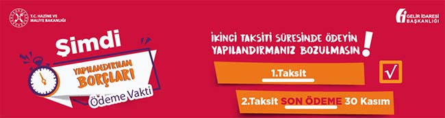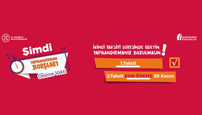 “7326 Sayılı Yapılandırma Kanunu kapsamında yapılandırılan borçların ikinci taksitinin ödeme süresi 30 Kasım 2021 Salı günü sona ermektedir. Yapılandırma işleminin bozulmaması için ikinci taksitin de süresinde ve tam olarak ödenmesi gerekmektedir.