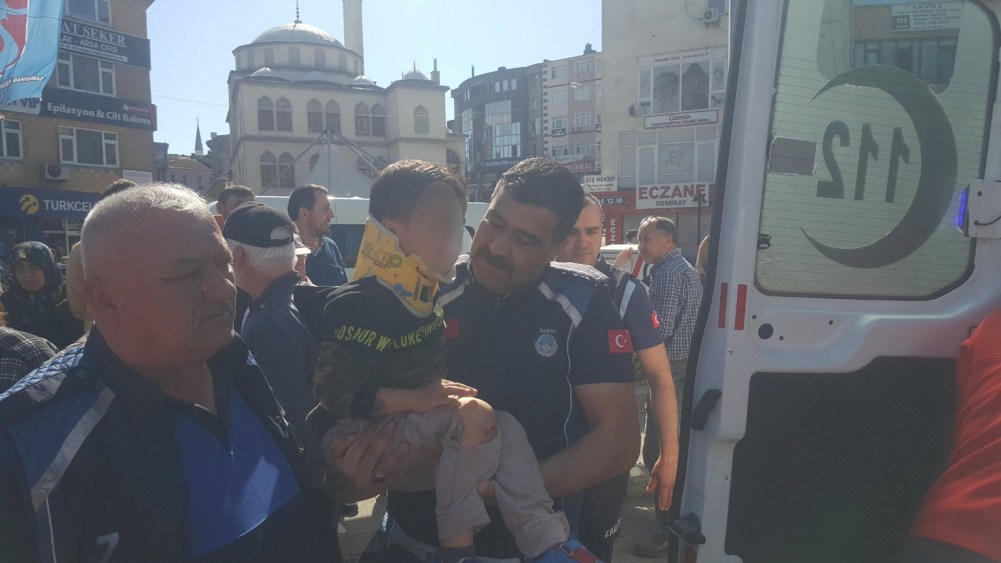 Karadeniz Ereğli’de meydana gelen trafik kazasında biri çocuk iki kişi yaralandı. Yaralılar olay yerinde yapılan ilk müdahalenin ardından özel hastaneye kaldırıldı. Küçük yaralı gözyaşlarına boğulduğu sırada kameraların kendisini çektiğini görünce gülümseyerek el salladı. Zabıta Memuru Hasan Sağlık ise çocuğun yanından bir an bile olsun ayrılmadı.