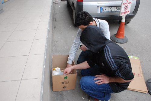 Yaralı martıyı, dershanelerine yaklaşık 25 metre geride bulduklarını anlatan Murat Koç (18) ve Burak Can Uslu (18), ?Dershaneye gelirken martının uçamadığını gördük. Tam yanına giderken havalanmaya çalıştı. Ancak uçamadı ve yere düştü. Karton kutu alıp geldik. Dershanenin önüne gelerek yemesi için kutunun içine poğaça koyduk. Yere düşerken ayaklarından bir kez daha yaralandı. İlk gördüğümüzde ayaklarında kan izi yoktu. Araba çarptı diye düşündük. Havalanmaya çalışırken ayaklarından yaralandı ve ayakları kan oldu. İçimiz acıdı. Çok üzüldük. Hemen veterinere gittik. Ama veteriner bize, bakamayacağını söyledi. Bunun üzerine zabıta ekiplerine haber verdik. Ekipler geldi ve yaralı martıyı aldı. İnşallah bir an önce iyileşir.? dediler.
