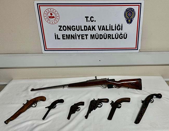 “Zonguldak İl Emniyet Müdürlüğü Kaçakçılık ve Organize Suçlarla Mücadele Şube Müdürlüğümüzce yapılan çalışmalar neticesinde İl Merkezimizde Yasadışı Yollarla Silah Temin Edip Satışının Yapıldığı bilgisi edinilmiş; Edinilen bilgilere istinaden, 28.07.2023 günü Zonguldak Cumhuriyet Başsavcılığının talimatları doğrultusunda yapılan ikamet aramasında; - 1 adet uzun namlulu Mauser - 2 adet tarihi nitelikte olduğu değerlendirilen toplu tabanca - 1 adet çift namlulu Piştov - 3 adet tek namlulu Piştov Ele geçirilmiş olup, konu ile ilgili Y.Y.(32) isimli şüpheli şahıs hakkında adli tahkikate başlanmıştır. “ denildi