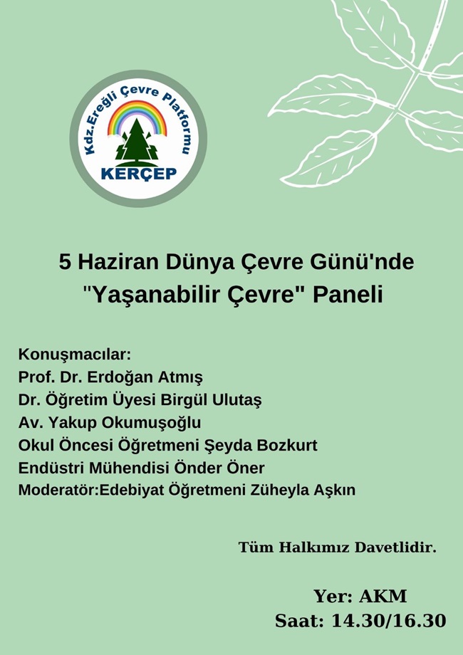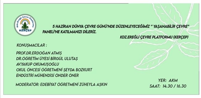 Kdz. Ereğli Çevre Platformu (KERÇEP) tarafından 5 Haziran Dünya Çevre günü nedeniyle "Yaşanabilir Çevre" konulu panel düzenlenecek.