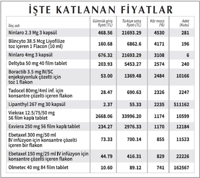200 - 300 TL olan kanser ilaçlarını hastanelere 20- 30 bin TL’den satıldığı, gümrükten giriş fiyatı ile ülkemizdeki satış fiyatı arasında 46 kata ulaşan büyük fiyat farklılıklarının olduğu anlaşılıyor.