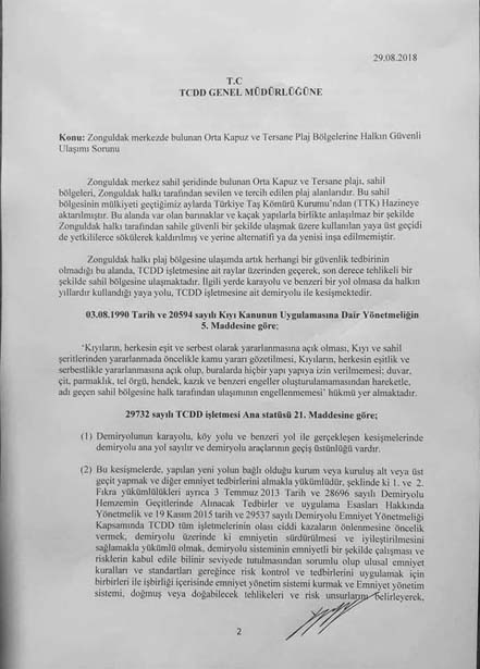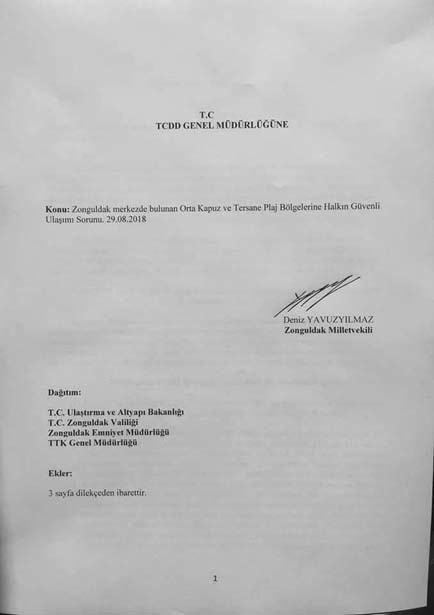 "Zonguldak'ta Orta Kapuz ve Tersane bölgesinden geçen rayların üzerinde insanların sahile, denize girilen bölgeye ulaşmasını sağlayan Devlet Demiryollarının eski bir üst geçidi vardı. Bu kaldırıldı. Kaldırılınca, tabii, sahile giden ve gelen insanların tren raylarının üzerinden geçmek suretiyle bir tehlikeyle karşı karşıya gelmeleri durumu oluştu.