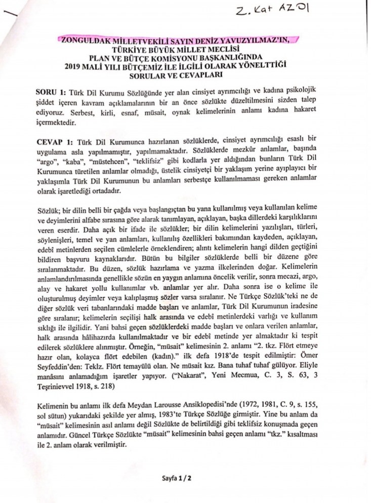 Cumhuriyet Halk Partisi Zonguldak Milletvekili Deniz Yavuzyılmaz'ın TDK'da yer alan, kadınları aşağılayan ve psikolojik şiddet sayılabilecek ifadelerin kaldırılması ile ilgili, Kültür ve Turizm Bakanı Mehmet Nuri Ersoy'a, Kültür ve Turizm Bakanlığı Plan ve Bütçe Komisyon Toplantısı'nda ilettiği talebe cevap geldi.