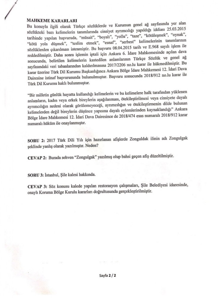 Bakanlık'tan gelen yanıtta kelimelerin ve tanımların