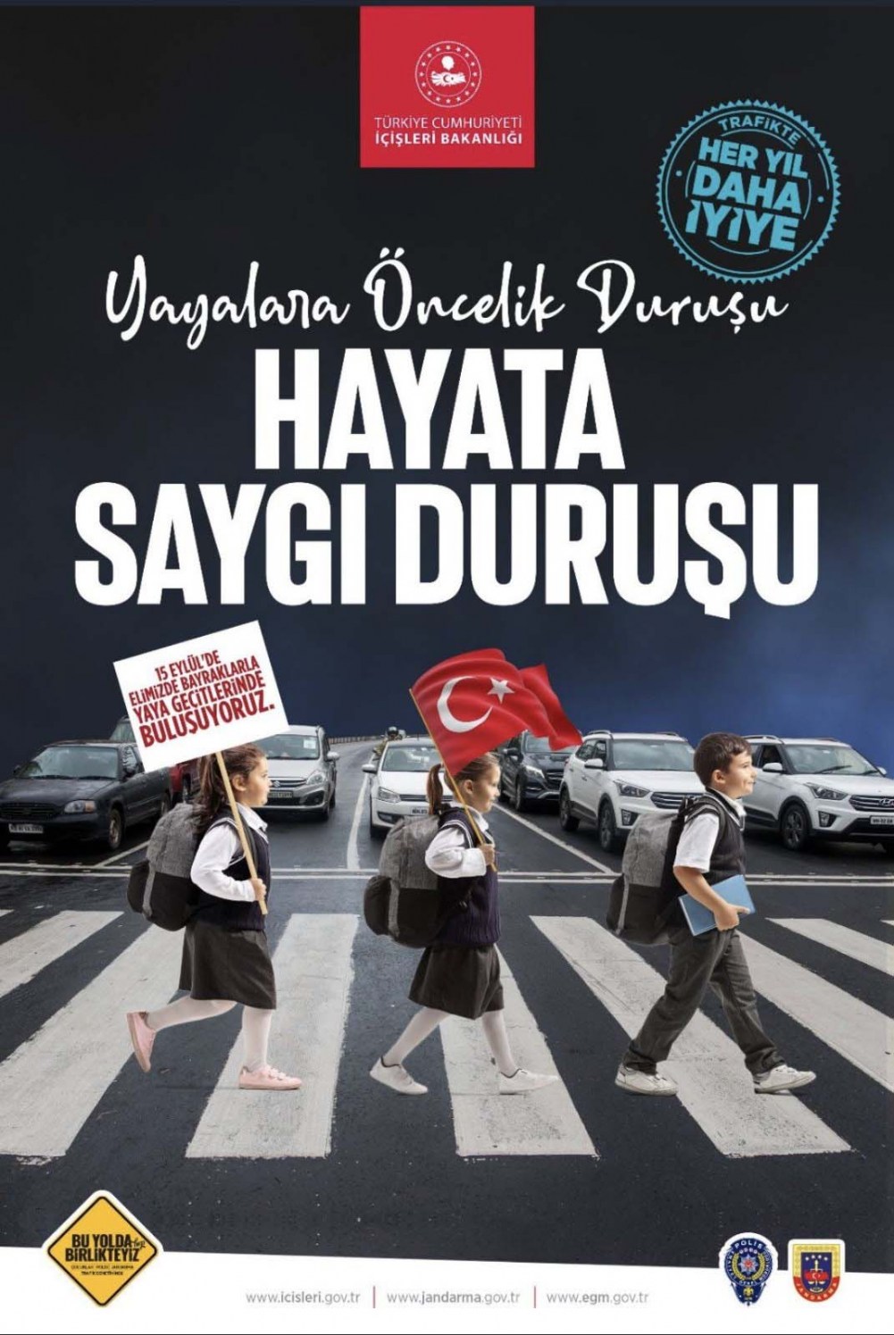 İçişleri Bakanlığınca trafikte yaya önceliğine dikkat çekmek ve sürücü duyarlılığını artırmak amacıyla "Yayalara öncelik duruşu, hayata saygı duruşu" sloganıyla başlatılan kampanya çerçevesinde yaya geçitlerindeki "Yayalara öncelik duruşu, hayata saygı duruşu" sloganıyla başlatılan kampanyayla trafik kazalarından kaynaklı can kayıplarının azaltılması hedefleniyor. Bu kampanya da farkındalık yaratma açısından ışıksız yaya geçitlerinde bulunan yaya çizgilerinden bir tanesi, kampanya etkinliği çerçevesinde sembolik olarak kırmızıya boyandı.