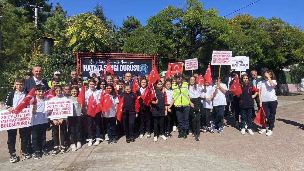 rafikte yaya önceliğine dikkat çekmek amacıyla Fener İlkokulu önünde ‘Yayalara öncelik duruşu, Hayata saygı duruşu’ etkinliği yapıldı.
