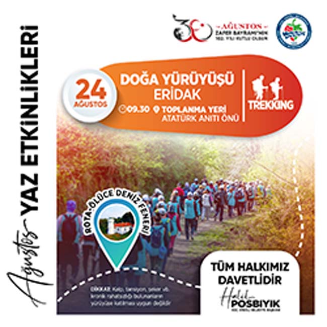 Kdz. Ereğli Belediyesi tarafından düzenlenen Ağustos 2024 Ayı etkinlikleri kapsamında 24 Ağustos Cumartesi ERİDAK(Ereğli İtfaiyecileri Doğa Sporları Arama ve Kurtarma Derneği) tarafından Ölüce Deniz Feneri’ne Doğa Yürüyüşü düzenlenecek. Etkinliğe katılmak isteyenler 09.30’da Atatürk Anıtı Önü’nde toplanacak.