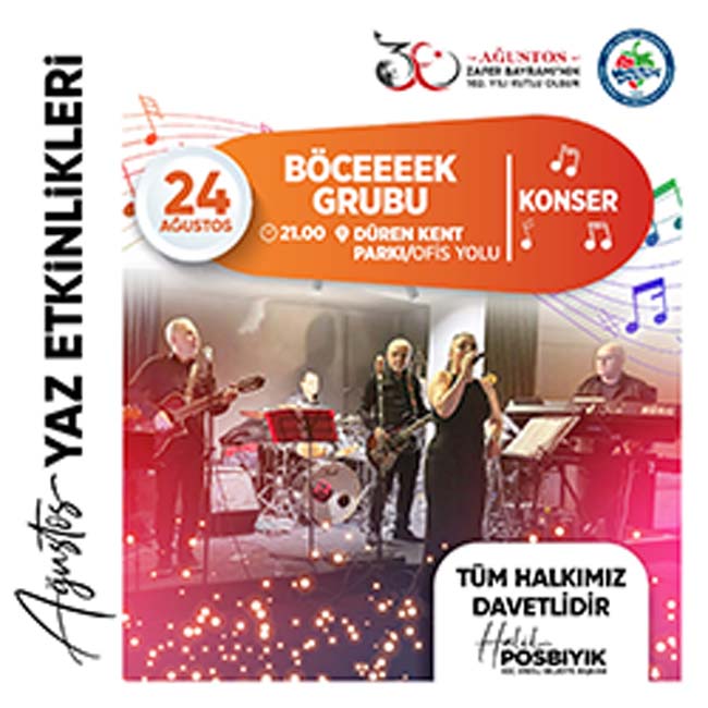 Aynı gün akşamında ise saat 21.00’de Düren Kent Parkı Sahil Ofis Yolu Süs Havuzu’nda Böceeeek Grubu sahne alacak.