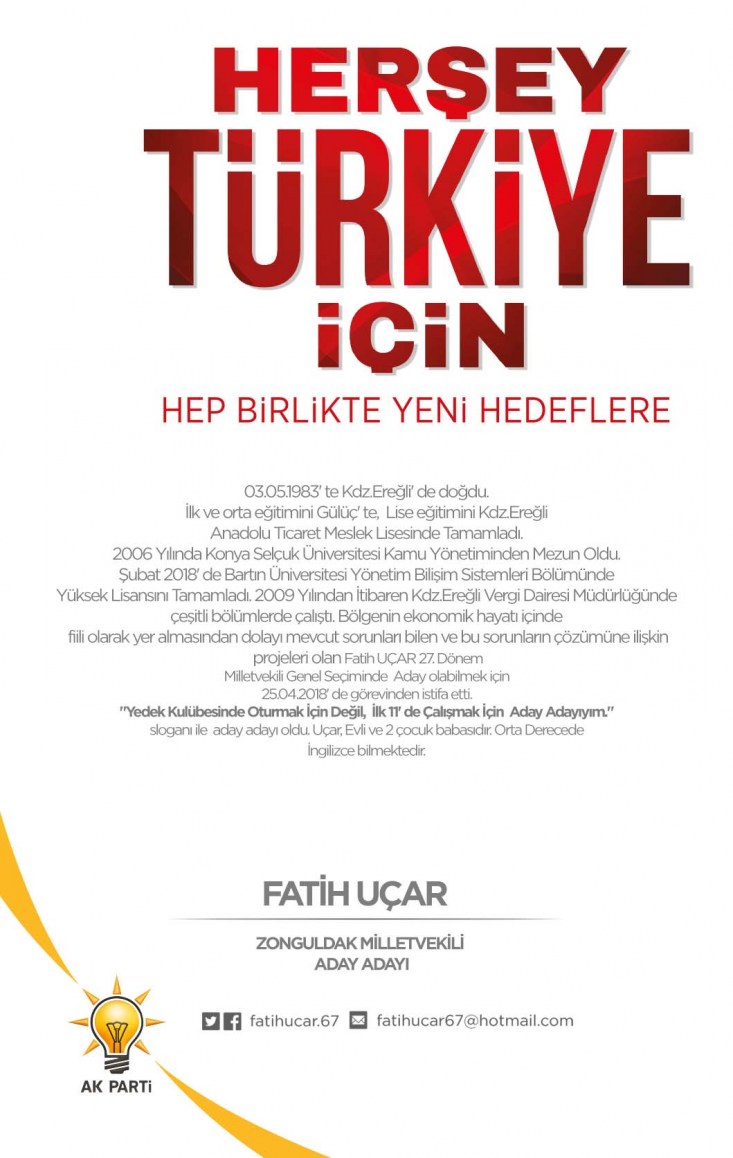 Zonguldak'ın Ereğli İlçesinde, Vergi Dairesi memurluğundan istifa eden Fatih Uçar, 27'nci Dönem Milletvekili Genel Seçimleri için resmi aday adaylığı başvurusunu yaptı. Cumhurbaşkanı ve 27'nci Dönem Milletvekili Seçimlerine yönelik aday adaylığı için görevinden istifa eden Fatih Uçar, AK Parti Zonguldak İl Başkanlığına giderek aday adaylığı başvurusunu AK Parti Zonguldak İl Başkanı Zeki Tosun'a teslim etti.