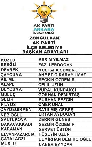 AK PArti İl Başkanı Zeki Tosun, sosyal medyada elden ele dolaşan listeden haberi olmadığını, Zonguldak İlçe ve Beldelerin toplu yapılacak açıklama ile önümüzdeki günlerde duyurulacağını söyledi.