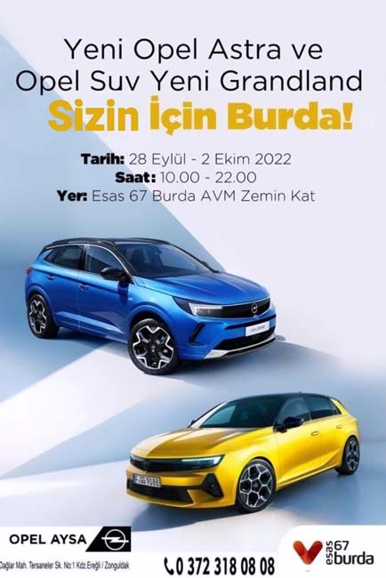 Karadeniz Ereğli Opel Aysa’dan yapılan açıklamada, “Yeni Opel Astra ve Opel Sun Yeni Grandland’ı keşfetmek isteyenleri 28 Eylül – 02 Ekim 2022 tarihleri arasında Zonguldak Esas 67 Burda Alışveriş Merkezi Zemin Katta kurulacak olan standa bekliyoruz” denildi.