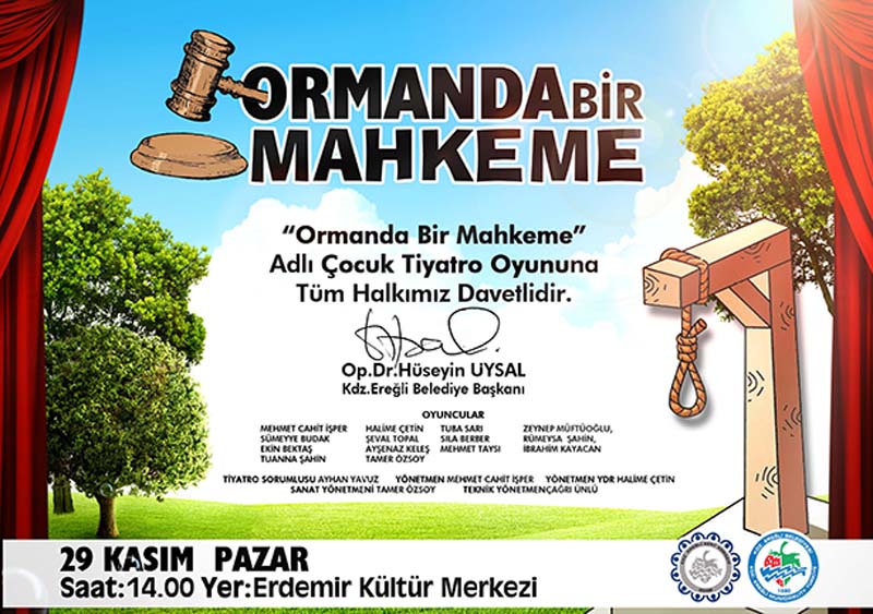 Mehmet Cahit İşler'in yönettiği ve tamamı yerel tiyatroculardan oluşan 'Ormanda bir mahkeme' adlı Çocuk Tiyatro Oyunu, 29 Kasım 2015 Pazar günü saat 14.00'te Erdemir Kültür Merkezi'nde sahnelenecek.