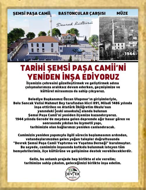 1944 yılında meydana gelen ve tarihte Gerede depremi olarak bilinen meydana gelen depremde yıkılan Şemsi Paşa Camisi Devrek’te aslına uygun yeniden inşa edilecek.