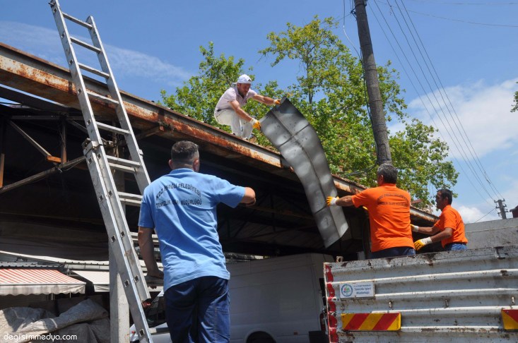 Uysal; "Pazaryerimize yeni WC, bay ve bayan mescitleri, bebek emzirme ve alt değiştirme odalarını yaptık. Şehit Rıdvan Caddesi üzerinde bulunan dükkânların çıkmaların yıkımı gerçekleşti. Burada yaya yolu ve trafik düzenlemesi çalışması yapacağız. Belediye meclisimizde çıkan karar doğrultusunda İller Bankası borçlanması ile çatı ve zemin değişimi çalışmalarına da başlıyoruz. Bugün köylü pazarı ve meyve - sebze satış yerlerindeki çatı ve zemin değişimi için söküm işlemleri başladı. Pazaryerindeki çirkin görüntüler tamamen ortadan kalkacak" şeklinde konuştu.