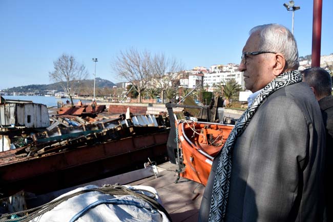 “Afette Amfi Tiyatro’nun önünde karaya oturan bu büyük gemiyi kaldırmak için Aliağa’dan uzman ekipler geldi, onlar parçalıyorlar. Parçalama esnasında amfi tiyatroda gölgelikleri dahi her şeyini kaldırdık, mecburen bir alan lazım onlara alanımıza kullanıyorlar. Burada başarılı bir operasyon devam ediyor, anında temizlik işlemlerine başlandı, büyük bir bölüm kaldırıldı. Yüzeysel olarak baktığımızda sanki bu parçalar azmış gibi gözüküyor ama esas denizin altında büyük parçalar var. 400 ton denizin altında malzeme var. Bunlar parça parça çıkarılıp tırlarla buradan sevk ediliyor. Belediye olarak bizimde zararımız çok büyük ama üstesinden geleceğiz. Bütün gayretimizle bu sahili önümüzdeki yaza festivallere ve etkinliklere hazırlayacağız. Zararın bütçesi büyük, devletten sadece 7 milyon lira geldi. Bunun haricinde harcamaları tamamen biz hallediyoruz. Allah razı olsun İstanbul Büyükşehir belediyesi bizi hiç bırakmıyor. İlk günden itibaren ekipler burada. Şu anda bir proje çalışması yapıyorlar, bizim ekiplerimizde devamlı İstanbul’da, birlikte çalışıyorlar. Bu proje çalışması öyle tahmin ediyoruz şubatın ilk haftalarında net hale gelecek ve ondan sonra süratle döşeme işlerine, üst yapı işlerine başlayacağız. Buradan İstanbul Büyükşehir Belediyesi’ne, değerli başkanımız Ekrem İmamoğlu’na Ereğli halkı adına yaptığı bu gayretler, yardımlar, destekler ve bizi hiç yalnız bırakmadığı için şükranlarımızı özellikle sunuyorum. Çalışmalarımız son hızıyla devam ediyor. İnşallah Ereğli halkı yaz ayında burada rahatça dolaşacak, yine festivallerini, eğlencelerini bu sahilde rahatça yapabilecek. Bundan herkes emin olabilir, oya gibi işleyeceğiz bu sahili tekrar. Eskiden ekiplerimizle birlikte nasıl yaptıysak, Türkiye’nin en güzel sahili haline getirdiysek, önümüzdeki yazda halkımız burayı değişik bir sahil gördüğünde herkes şaşkına döneceğinden eminim ve büyük bir beğeniyle sahilin tadını çıkaracaklarından eminim.”
