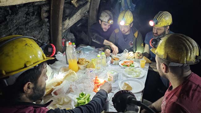 15 yıllık maden işçisi Can Köseli, kazasız belasız çalışmayı dileyerek, ilk sahuru mesai arkadaşlarıyla birlikte yaptıklarını anlattı. Köseli, "Burada 15 yıllık maden işçisiyim. Son 5 yılımda da çavuş olarak çalışıyoruz. Bugün Ramazan ayının ilk günü. Allah ilk sahuru da yer altında arkadaşlarımızla birlikte yapmayı nasip etti. Peynir, domates, soğanımız, salatalığımız ve en değerlisi arkadaşlarımızla beraber sahurumuzu yapacağız. Sahurdan sonra işimize devam edeceğiz. Allah bize buradan sağ salim çıkmayı nasip etsin. Bütün madenci arkadaşlarımız kazasız belasız herkes ailesine kavuşsun. En büyük temennimiz bu. Bizim için en değerli şey amirler olarak yer altından çıkan arkadaşlarımızdır. Kömür ikinci plandadır. Önce emniyet diyoruz her zaman olduğu gibi. Biz burada bir aileyiz. İllaki ailemizden ayrı geçirmek buruk oluyor. Bir yandan iyi oluyor. Arkadaşlarımızla beraberiz. Zaten ailemizden fazla beraber vakit geçiriyoruz. Evde fazla bir zamanımız olmuyor" diye konuştu.