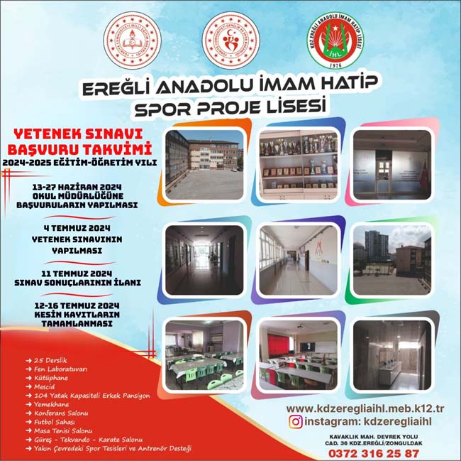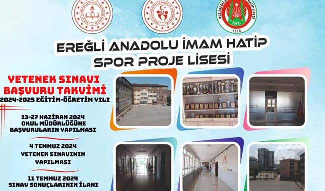 Kdz. Ereğli İHL spor programına sınavla 30 öğrenci aKdz. Ereğli Anadolu İmam Hatip Lisesi Spor Programı Uygulanan alana 9. Sınıf düzeyinde yetenek sınavı ile 30 öğrenci alacak.