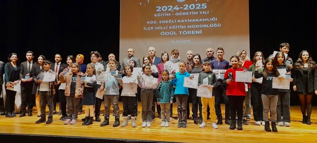 2024-2025 Eğitim-Öğretim Yılı 1. Döneminde düzenlenen sosyal ve kültürel faaliyetlerde başarı gösteren öğrenci ve öğretmenler için İlçe Milli Eğitim Müdürlüğü tarafından ödül töreni düzenlendi. Programa, İlçe Milli Eğitim Müdürü Harun Akgül, şube müdürleri, okul müdürleri, öğretmenler, öğrenciler ve veliler katıldı.
