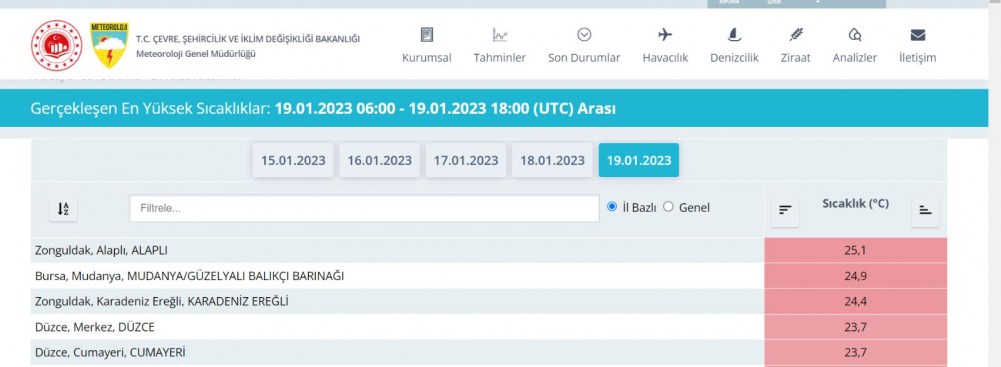 Meteoroloji Genel Müdürlüğü, 19 Ocak’a ait ölçülen en yüksek ve en düşük sıcaklık verilerini paylaştı. Alaplı ilçesi 25,1 derece ile ilk sırada yer alırken 3’üncü sıradaki Ereğli ilçesinde sıcaklık 24,9 olarak ölçüldü. Güneşli hava bugün de etkisini sürdürürken vatandaşlar deniz kenarlarına ve parklara giderek havanın tadını çıkardı.