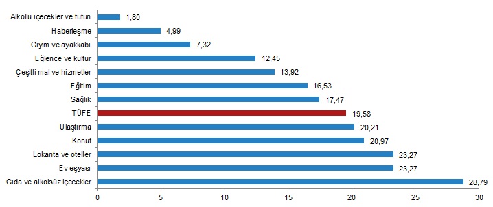 Yıllık en düşük artış yüzde 1,80 ile alkollü içecekler ve tütün grubunda gerçekleşti. Bir önceki yılın aynı ayına göre artışın düşük olduğu diğer ana gruplar sırasıyla, yüzde 4,99 ile haberleşme, yüzde 7,32 ile giyim ve ayakkabı ve yüzde 12,45 ile eğlence ve kültür oldu. Buna karşılık, bir önceki yılın aynı ayına göre artışın yüksek olduğu ana gruplar ise sırasıyla, yüzde 28,79 ile gıda ve alkolsüz içecekler, yüzde 23,27 ile ev eşyası ve yüzde 23,27 ile lokanta ve oteller oldu.