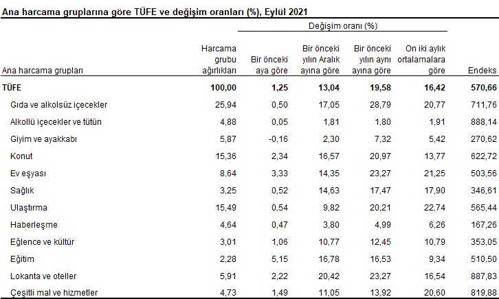 Aylık düşüş gösteren tek ana grup yüzde 0,16 ile giyim ve ayakkabı oldu. Ana harcama grupları itibarıyla 2021 yılı Eylül ayında en az artış gösteren ana gruplar yüzde 0,05 ile alkollü içecekler ve tütün, yüzde 0,47 ile haberleşme ve yüzde 0,50 ile gıda ve alkolsüz içecekler oldu. Buna karşılık, 2021 yılı Eylül ayında artışın yüksek olduğu gruplar ise sırasıyla, yüzde 5,15 ile eğitim, yüzde 3,33 ile ev eşyası ve yüzde 2,34 ile konut oldu.