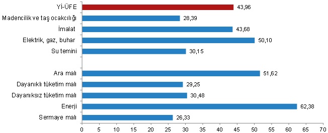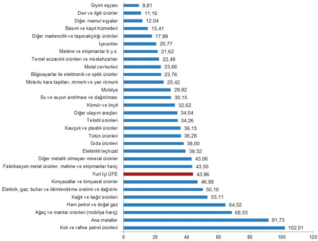Yıllık en düşük artış; yüzde 9,81 ile giyim eşyası, yüzde 11,16 ile deri ve ilgili ürünler, yüzde 12,04 ile diğer mamul eşyalar olarak gerçekleşti. Buna karşılık kok ve rafine petrol ürünleri yüzde 102,01, ana metaller yüzde 91,73, ağaç ve mantar ürünleri (mobilya hariç) yüzde 68,53 ile endekslerin en fazla arttığı alt sektörler oldu.