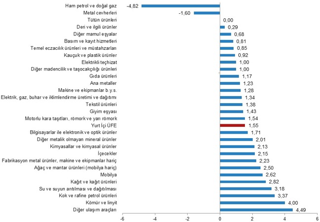Aylık azalış; yüzde 4,82 ile ham petrol ve doğal gaz, yüzde 1,60 ile metal cevherleri alt sektörlerinde gerçekleşti. Buna karşılık diğer ulaşım araçları yüzde 4,49, kömür ve linyit yüzde 4,00, kok ve rafine petrol ürünleri yüzde 3,37 ile endekslerin en fazla arttığı alt sektörler oldu.