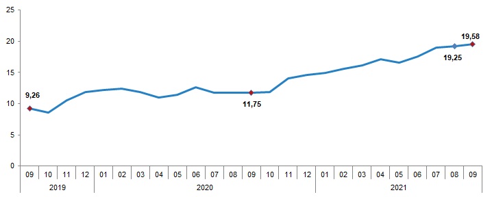 Yİ-ÜFE 2021 yılı Eylül ayında bir önceki aya göre yüzde 1,55, bir önceki yılın Aralık ayına göre yüzde 30,50, bir önceki yılın aynı ayına göre yüzde 43,96 ve on iki aylık ortalamalara göre yüzde 33,83 artış gösterdi.