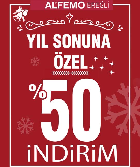 Karadeniz Ereğli'de hizmet veren ALFEMO mağazaları yılsonuna özel tüm ürünlerde %50 indirim uygulamaya başladıklarını bildirdi.
