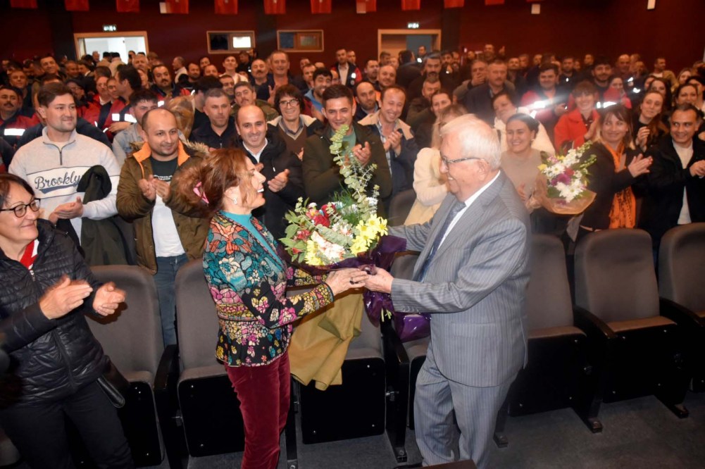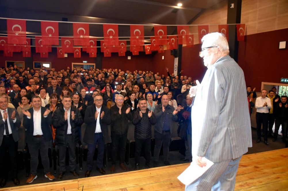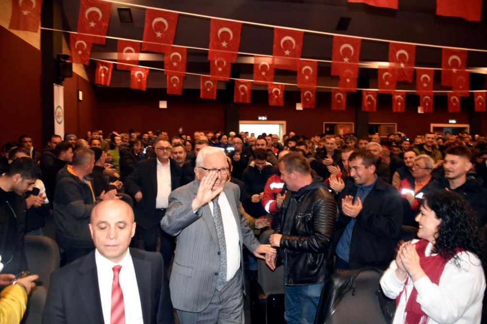 Şuanda belediyeye transfer olmak isteyen, devlet dairelerinden ve bir çok yerden müracaatlar var. Neden? Üç kuruş daha fazla alalım, orada huzur iyi, belediyede istikrar da çok iyi diye Ereğli Belediyesi’ne geçmeye çalışanlar var. Hatta Erdemir’de bile espri yapıyorlar ‘Belediye maaşları bizi geçmeye başladı’ diye. Benim yıllardan beri en büyük hayalim emek veren işçilerimizin haklarını zamanında ödemektir. Hiç kimsenin alın terinin karşılığını vermeden çalıştırmak ve verim almak mümkün değildir. Sivil hayatımdan beri, Erdemir’den beri, belediye başkanlığı yaptığım her dönemde alın terinin karşılığını vermek, onlara güler yüzlü davranmak yeri geldiğince hafifçe okşamak sonra da verim almak benim önceliğim olmuştur. Onun için aramızda büyük bir sevgi var karşılıklı. Siz benim Aşkım Ereğli’ye hizmet ediyorsunuz bende sizleri seviyorum, sizlere saygı duyuyorum. Belediyemizce şirket işçileri var. İnşallah onlara da kanun çıkarırlar ve kadroya alırız. O iş benim işim değil ama sendika yetkililerine büyük görev düşüyor burada.