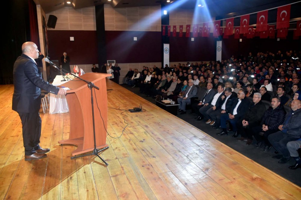 “Biz işçiyiz, emekçiyiz, üretiriz, üretimden gelen gücümüzü kullanırız. Bu enflasyonda sıcağa kar dayanmaz dedikleri gibi maaşlar eridi ancak sayın Belediye Başkanımız ek protokol yaparak çok güzel bir sözleşmeye imza attık. Bu enflasyonun sorumlusu belediye başkanları değil bu ülkeyi yönetenlerdir. Biz emekçiler, işçiler şapkamızı önümüze koyup düşünmek zorundayız. Sorunun kaynağını bilmek, kim emekten yana kim alın terinden yana, kim işçi çocuklarını da kendi çocukları gibi görüyor, kim işçinin ailesini de ailesi gibi görüyor bunu ayırt etmek zorundayız. Onun için Belediye Başkanımız Halil Posbıyık’a sendikam adına defalarca teşekkür etsek azdır. Bize bir adım atana bizde 10-20 adım geleceğiz sayın başkanım. Sizin yanınızdayız, sizinle her zaman gurur duyuyoruz. Bizler işçiyiz, siyaset yapmayız. Siyaseti siyasi partiler yapıyor. Ancak biz politika yaparız. Çünkü bizim hedefimiz çoluk çocuğumuzu namerde muhtaç ettirmemek, yaşamını, geçimini sağlamaktır. Başkanım her zaman emekçinin yanında oldu. Bizde her zaman onun yanında, emekten yana, Atatürk’ten yana Cumhuriyetten yana olan herkesin yanında olacağız. Belediye-İş sendikasının partisi yoktur. İlla parti deniyorsa partisinin adı Laik Türkiye Cumhuriyeti’dir. Liderinin adı da Mustafa Kemal Atatürk’tür. Bu ek sözleşmenin tüm üyelerimize hayırlı uğurlu olmasını diliyorum.”