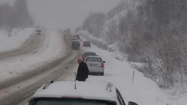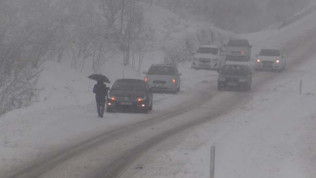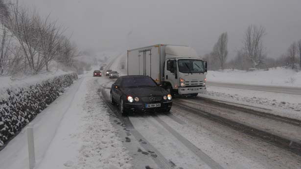 Bu arada bazı kamyonlar da yokuşta kardan çıkamadı. Bütün ormanlık alanı kaplayan beyaz güzellik ile yollarda mahsur kalan araçların iç içe bulunduğu görüldü.