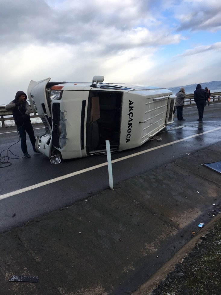 Edinilen bilgiye göre, İsmail Şeker idaresindeki 81 KC 880 plakalı minibüs, Alaplı - Akçakoca Karayolunun Kavukkavla mevkisinde sürücünün direksiyon hakimiyetini kaybetmesi sonucu orta refüjdeki bariyerlere çarparak devrildi.