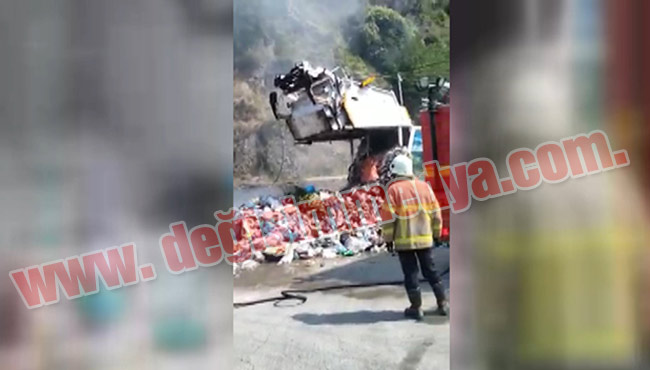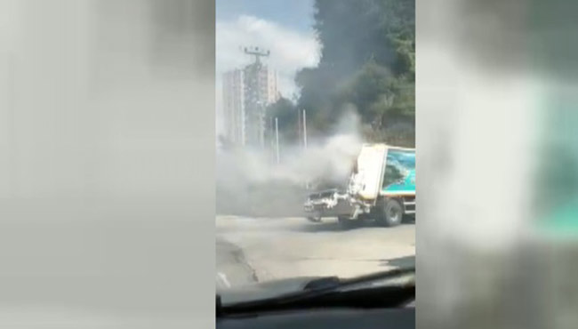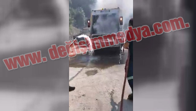 Zonguldak’ın Alaplı İlçe Belediyesine ait çöp kamyonu yolda seyir halindeyken yanmaya başladı. Aracın yandığını gören sürücü Gülüç Belediyesi Fen İşleri Müdürlüğüne girmesi ile vatandaşlar, gazeteciler ve Gülüç belediyesi personeli tarafından yangına müdahale edildi.