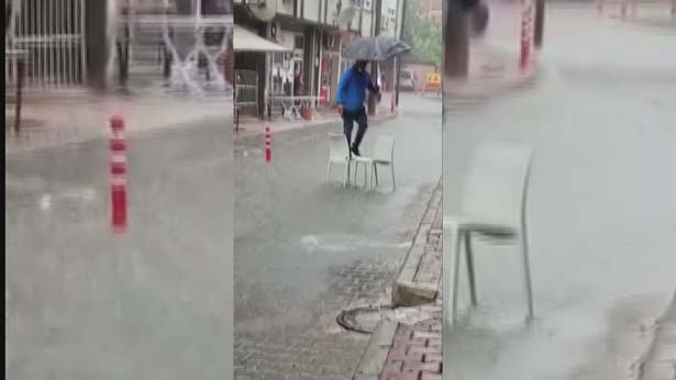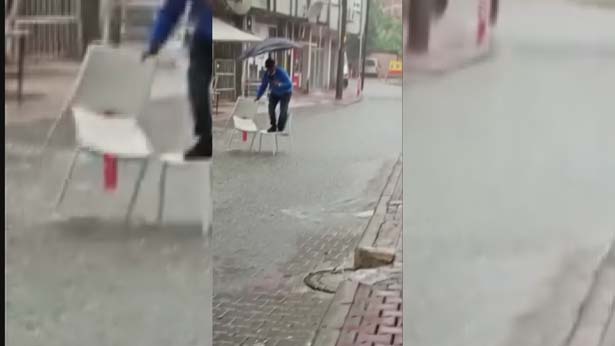 Esnaflık yapan Sezgin Çiftçi de o anları cep telefonuna kaydetti. İlginç görüntüyü sosyal medya hesabında paylaşan Çiftçi, "Vatandaşımız yağmur şiddetlendiği için karşıya geçemedi. Acil bir işi varmış. Tam sandalyelerle karşıya geçerken bende o anının videosunu çektim. Şemsiyesi vardı. Islanmadı. Kendisi gurbetçiymiş" diye konuştu.