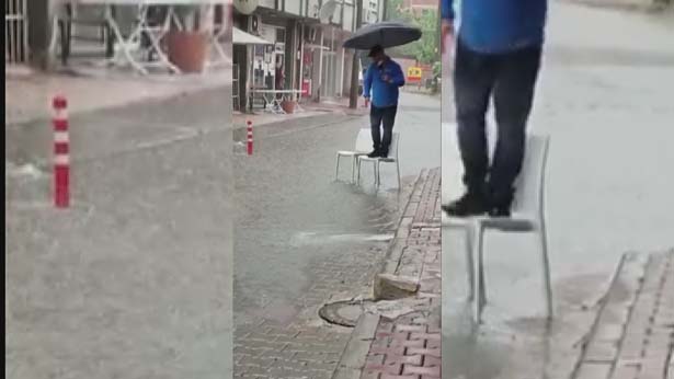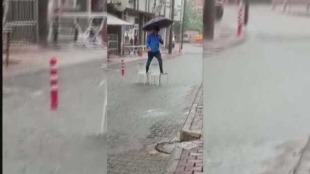 Zonguldak'ın Devrek ilçesinde önceki gün yaşanan yağış sonrası yaya yolunun su içinde kalması üzerine bir vatandaş sandalyelerle karşıya geçti. Bir esnaf ise o anları cep telefonu ile kaydetti.