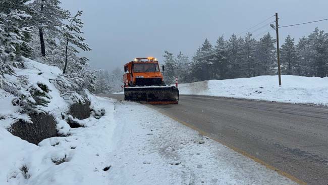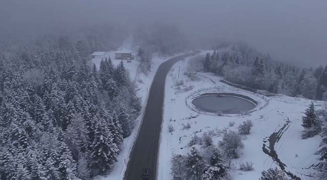 Kar yağışı ve sisin etkili olduğu bölgede oluşan manzara havadan görüntülenirken, Karayolları ekipleri de ulaşımda aksama yaşanmaması için kar küreme ve tuzlama çalışması gerçekleştirdi.
