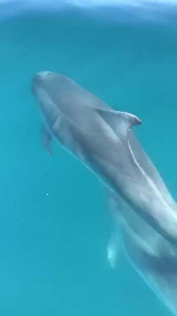 Ara ara tekneden uzaklaşan yunuslar bir süre sonra yeniden teknenin yanına gelerek Azaklıoğlu'na eşlik etti.