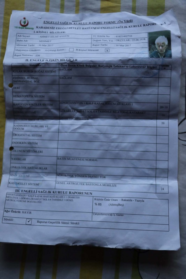 Kocasından ayrı yaşayan 39 yaşındaki Perihan Akman ise babasının bütün ihtiyaçlarını kendisinin giderdiğini söyledi. Babası Ahmet Hilmi Aygün'ü Ereğli Devlet hastanesinde heyete soktuklarını ancak heyetin babasına sağlam raporu verdiğini kaydeden Perihan Akman "Babama ben bakıyor ihtiyaçlarını ben karşılıyorum. Rahatsız olduğundan bir yere gidemiyoruz. Kendi başına bir yere gönderemiyoruz. Yetkililerden yardım istiyoruz. Bir arkadaşın vasıtası ile hastaneye götürdük. Babamın sağlım olduğunu ya felç ya da yatalak olması gerektiğini söylediler" dedi.