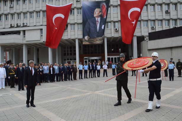 Atatürk Anıtı'na, Valilik ve Belediye Başkanlığı çelenkleri sunuldu. Saygı duruşunun ardından İstiklal Marşı'nın okunduğu törende Türk bayrağı askerler tarafından göndere çekildi. Vali Ahmet Çınar ve beraberindekiler makamda tebriklerin kabulünü gerçekleştirdi.