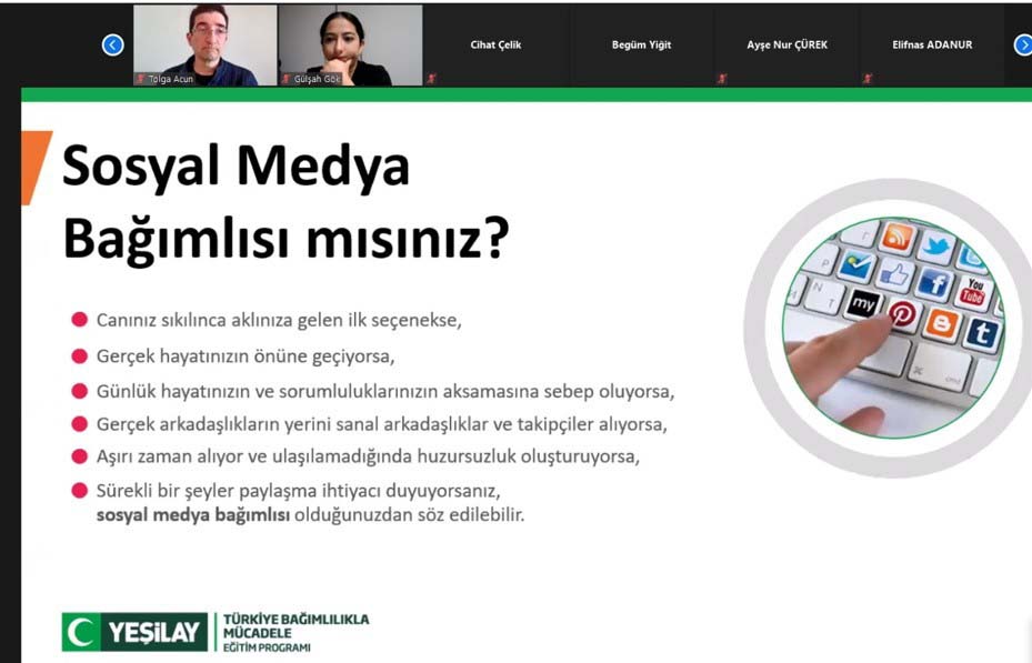 Son olarak, Yeşilay Zonguldak Şubesi Koordinatör Formatörü Rehber ve Psikolojik Danışman Aynur Gözübek tarafından bağımlılık konusunda bir eğitim düzenlendi. Söz konusu eğitimde bağımlılık kavramı, bağımlılık döngüsü, teknoloji bağımlılığı ve belirtileri, teknoloji bağımlılığında riskli konumda bulunanlar, teknoloji bağımlılığı türleri, oyun bağımlılığı, cep telefonu bağımlılığı, sosyal medya bağımlılığı, bağımlılıklarla mücadele yöntemleri ve Yeşilay Danışmanlık Merkezleri konularına yönelik ayrıntılı bilgiler verildi.