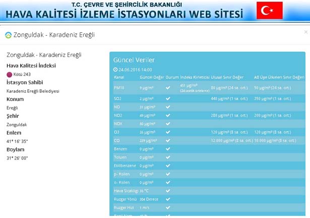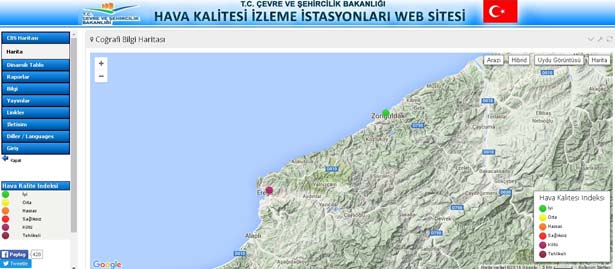 Hava kalitesi izleme haritasında, doğalgaz dönüşümünü büyük oranda gerçekleştirememiş Zonguldak'ın hava kalitesi "İyi" ifadesine karşılık gelen yeşil renkte gösterilirken, Karadeniz Ereğli'nin hava kalitesi, "Kötü" ifadesine karşılık gelen mor renkte gösterilmiş.