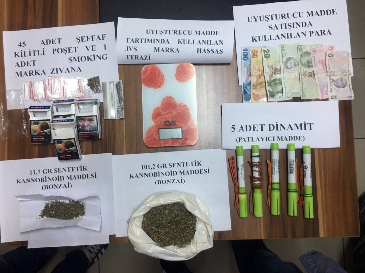 dinamit ve 5 adet şeffaf poşet ile hassas terazi ele geçirildi.