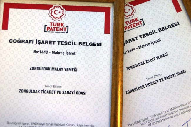 Tescil edilen Zonguldak Malay Yemeği ve Zonguldak Zılbıt Yemeğinin tescil belgeleri Türk Patent ve Marka Kurumu’nda düzenlenen törenle teslim alındı. Belge teslim töreninde, Türk Patent ve Marka Kurumu Yönetim Kurulu Başkanı Cemil Başpınar, Zonguldak Ticaret ve Sanayi Odası Yönetim Kurulu Başkanı Metin Demir, Genel Sekreter Muharrem Sarıkaya, Batı Karadeniz Kalkınma Ajansı Yatırım Destek Ofisi Koordinatörü Mustafa İnanır, Turizm ve Tanıtım Birim Başkanı Mehmet Çetinkaya ve Coğrafi İşaret Danışmanı Huriye Özener hazır bulundu.