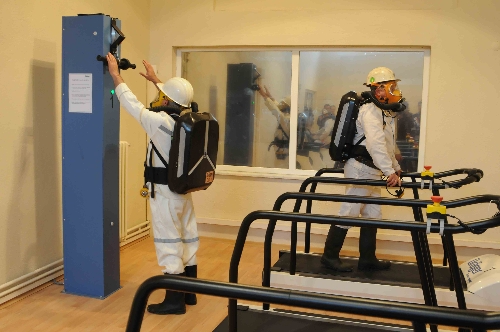 Daha sonra Tahlisiye İstasyonu´nda görevli 3 personelin katılımıyla tatbikat gerçekleştirildi. Özel maske ve cihazlarla donatılan tahlisiyeciler, önce salondaki kondisyon aletlerinde fiziksel teste tabi tutuldu.