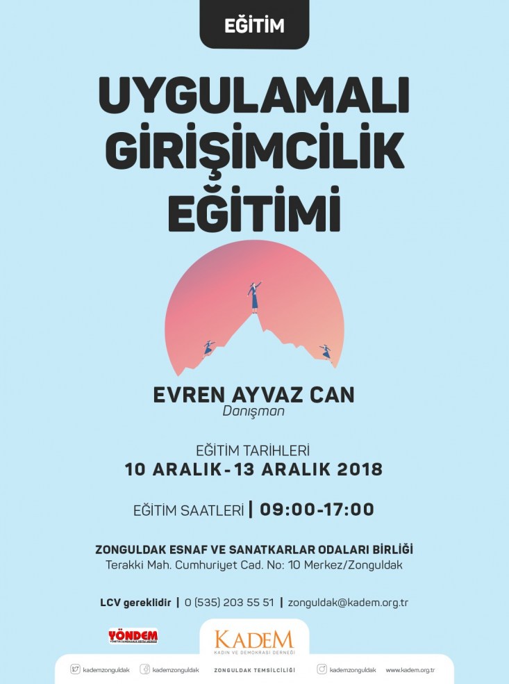KADEM Zonguldak, İş-Kur, KOSGEB, işbirliği ile organize edilen girişimcilik eğitimi 10 Aralık 2018 tarihinde KADEM temsilcilik binasında başladı.