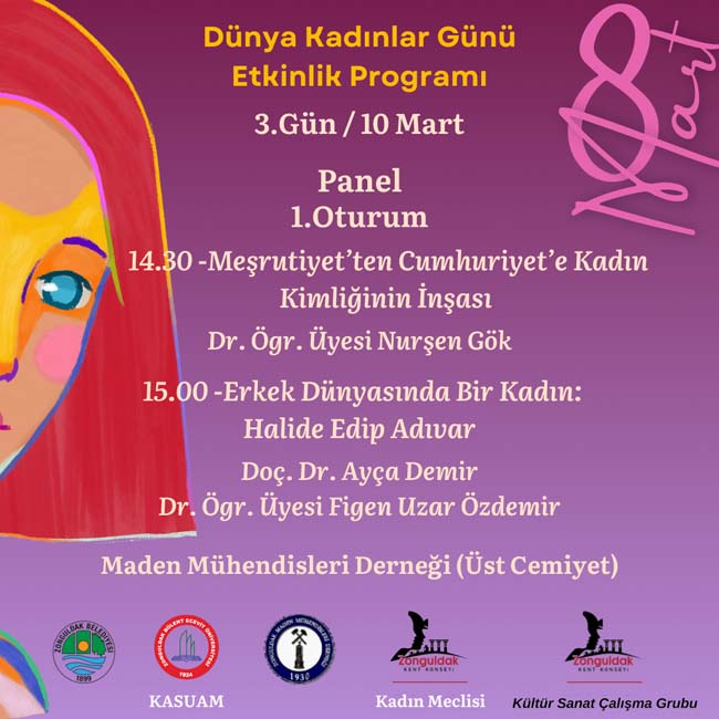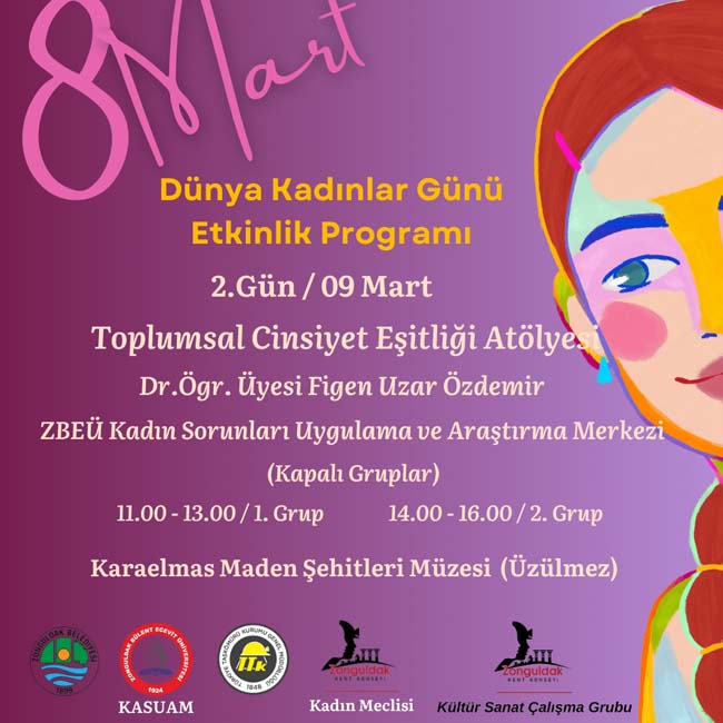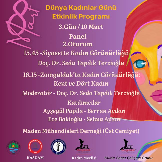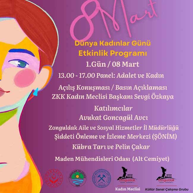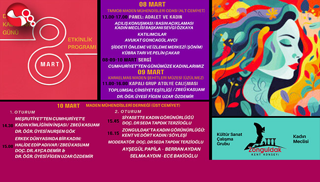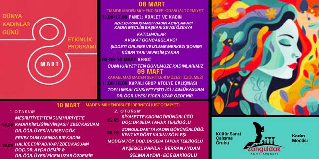 Zonguldak Kent Konseyi Kadın Meclisi ve Kültür Sanat Çalışma Grubu, ‘08 Mart Dünya Kadınlar Günü' etkinliği kapsamında Zonguldak Aile ve Sosyal Politikalar İl Müdürlüğü, Zonguldak Bülent Ecevit Üniversitesi Kadın Sorunları Uygulama ve Araştırma Merkezi (ZBEÜ KASUAM) iş birliğiyle, Zonguldak Belediyesi, Türkiye Taşkömürü Kurumu ve TMMOB Maden Mühendisleri Odası' ve Maden Mühendisleri Derneği’nin katkılarıyla 08-09-10 Mart 2024 tarihlerinde bir dizi etkinlik düzenliyor.