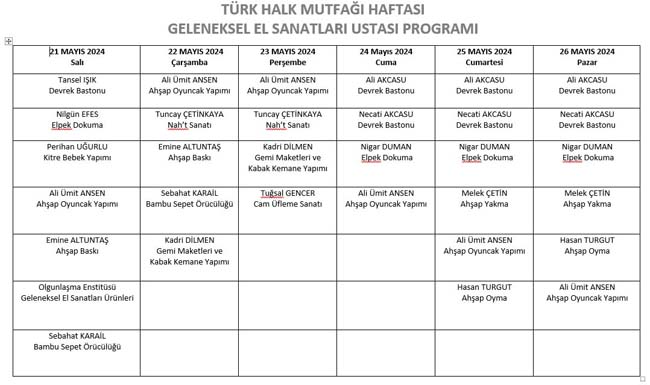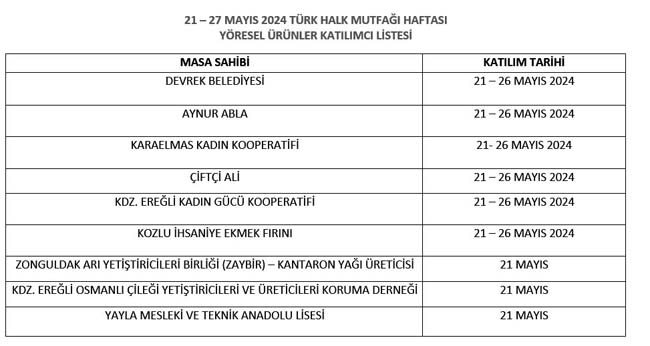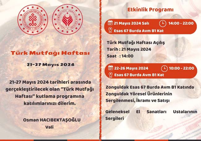 “Cumhurbaşkanlığımız ve Sn. Emine Erdoğan Hanımefendilerinin himayelerinde, 21 – 27 Mayıs 2024 tarihleri arasında ülkemizde ve dış temsilciliklerimiz aracılığıyla tüm dünyada kutlanacak olan “Türk Mutfağı Haftası”nın bu yıl 3’üncüsünü İlimizde de çeşitli etkinliklerle kutlanacaktır.